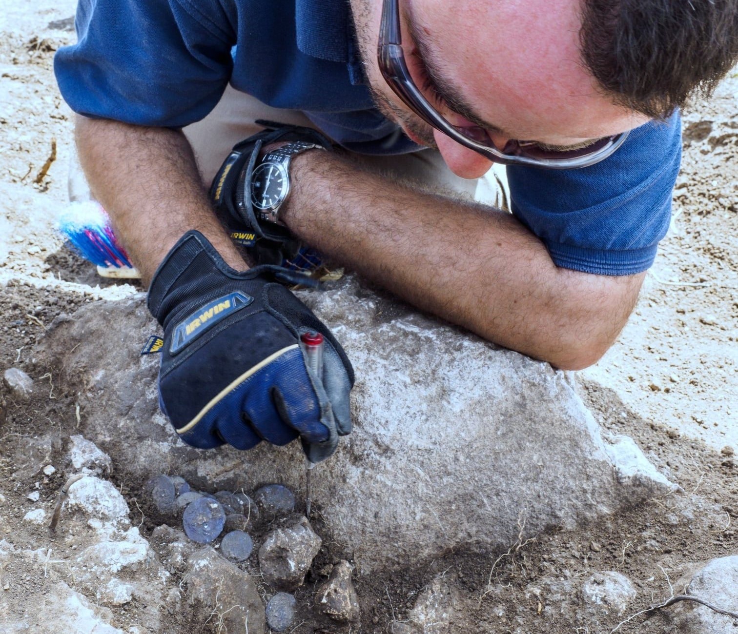 Ancient coins from the era of the Bar Kochba Revolt, in the area where they were found in the Judean desert in Israel (Photo credit: Oriya Amichai/Israel Antiquities Authority)
