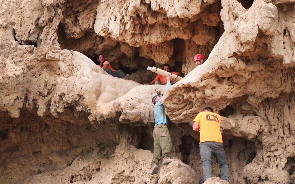 Archaeologists removing the swords from the entrance of the cave where they were found in the Judean desert (Photo credit: Emil Aladjem/IAA)
