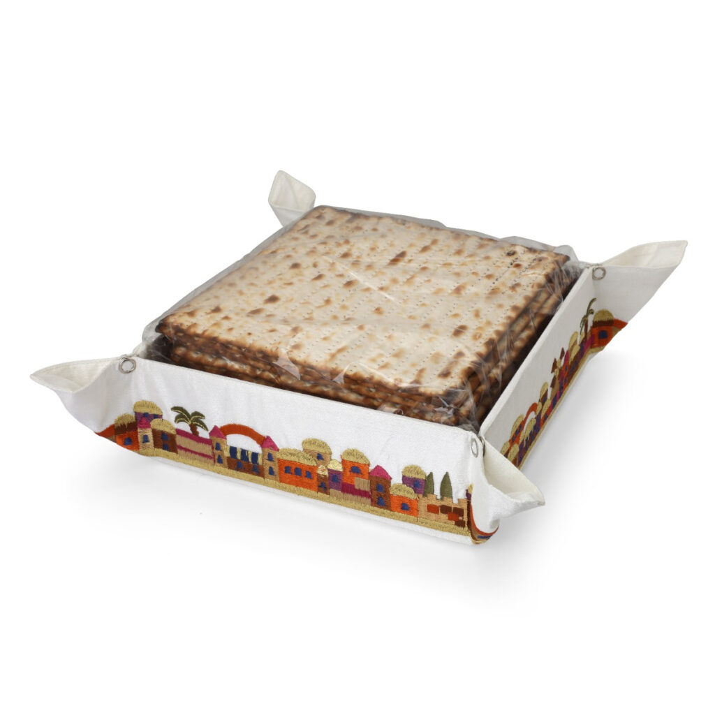 A decorative cloth used to hold and cover the three matzot (plural of matzah) used during the Seder. These three pieces of matzah represent different aspects of Jewish identity and the Exodus story, and keeping them covered until they’re needed is part of the traditional ritual. Most matzah covers feature three separate pockets or compartments, one for each matzah, making it easy to access the specific piece you need at each stage of the Seder.