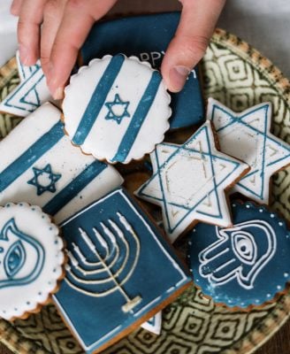Make these simple yet delicious sugar cookies, then decorate them with blue and white frosting and make holiday designs – a great activity if your children are into crafts or even just expressing their Jewish pride. And if you have holiday-themed cookie cutters like Stars of David, even better!