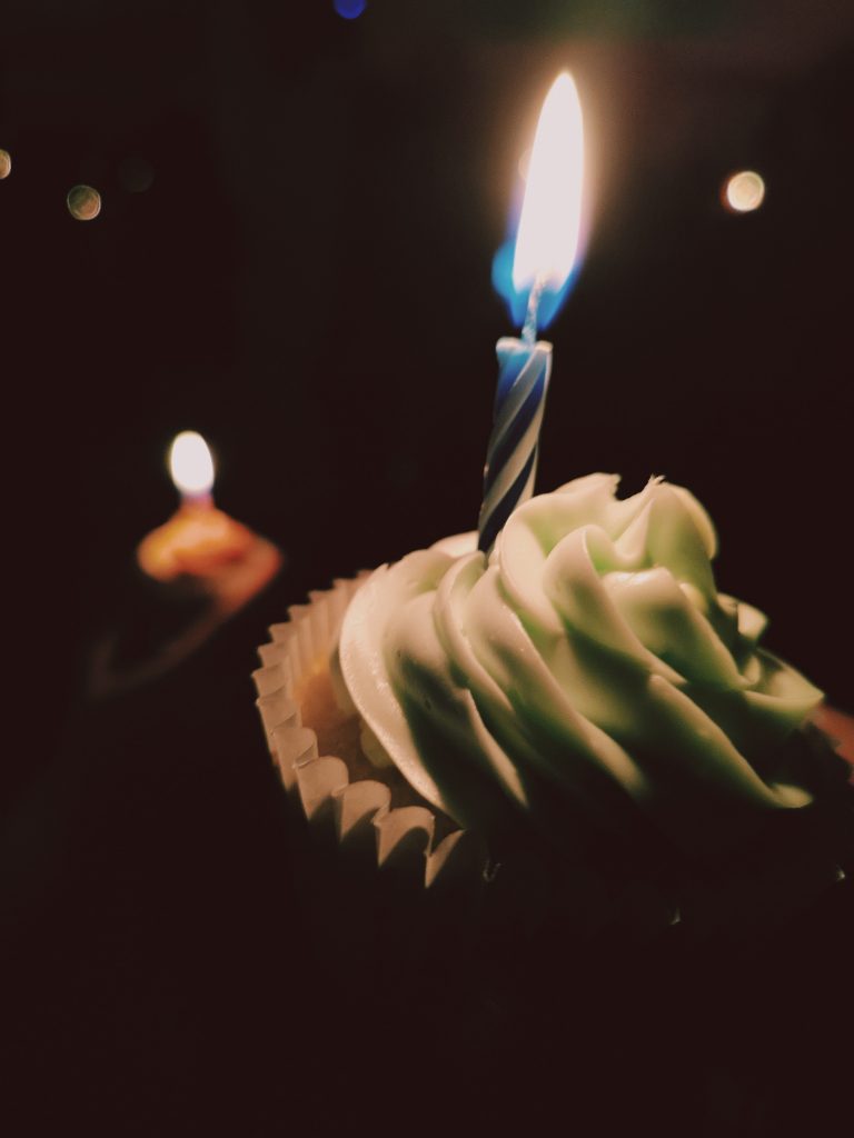 Line up 8 cupcakes in a straight line with a 9th raised on a small base in the middle (an upturned small bowl works), and then stick Hanukkah candles in them!
