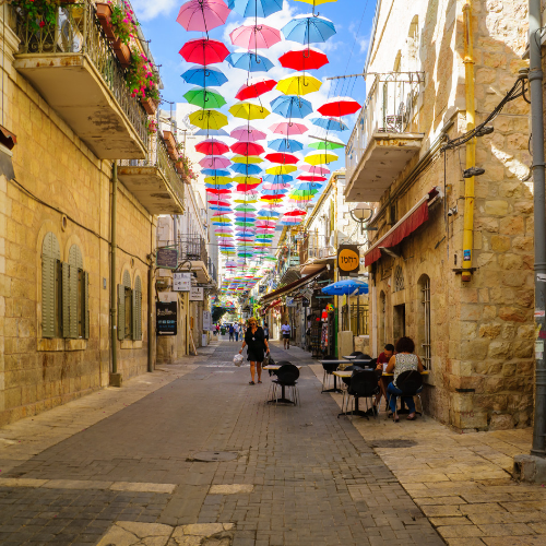 What is now considered part of the neighborhood of Nachlaot, Nachalat Shiva was the third neighborhood established outside the Old City. All the buildings in the area are restored to look as they did in the late 1800s, giving it a magical touch. Many of the streets are filled with cafes and tiny shops selling the most beautiful things. In the summer, colorful umbrellas hang from the rooftops giving shade to pedestrians from the hot Israeli sun.