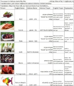 Click on the chart below for an explanation of the different foods used and the prayers said over them. Feel free to print it out to use at your Rosh Hashanah meal!