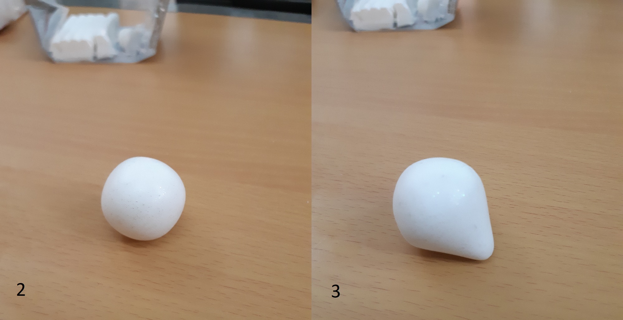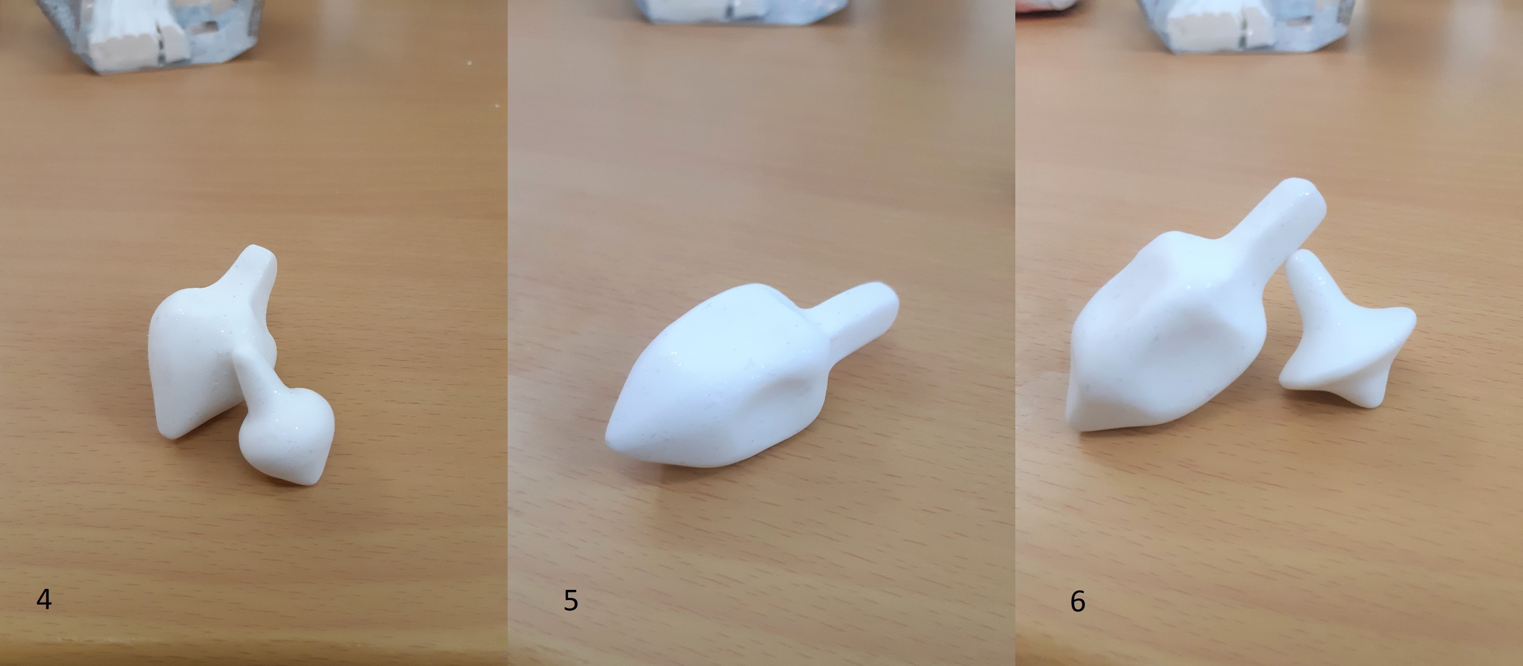 The first thing you want to do with your clay is to play around with it a little. This will warm up the product, making it more malleable and less prone to cracks or lumps. Once you’re satisfied with the way your clay feels, go ahead and roll it into a ball. Try to get it as smooth as you can so there are no noticeable flaws in the clay that might show up later. After you’ve made your ball, lightly roll one side along a flat, even surface or use your fingers to gently pinch a bit of clay into a conical shape. This will become the point of your Dreidel. If possible, try not to make it too pointy since you want your Dreidel to spin. Ideally, it should look somewhat similar to an ice cream cone, as shown in picture 3.