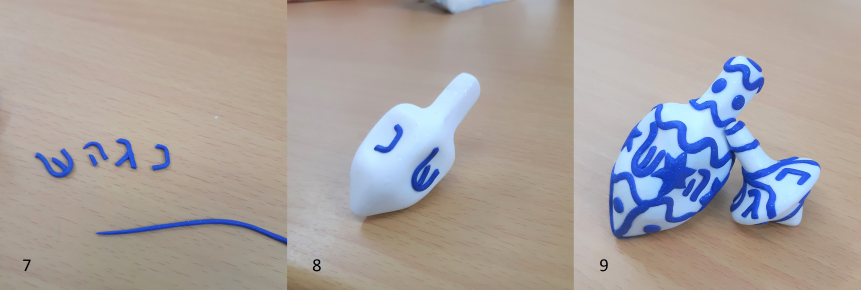 Start by making the Hebrew letters to put around your Dreidel. You can either roll out a sheet of clay and cut out your letters, or make a thin clay rope and use that to sculpt your Nun, Hay, Gimmel, and Shin. Once you’ve made your letters, stick them on! Finish decorating your Dreidel the way you want by adding decorative borders and any other details you want your Dreidel to have! We liked the idea of using the Israeli Flag as inspiration for our Dreidel, so we added lots of wavy blue borders and Stars of David to our first Dreidel.