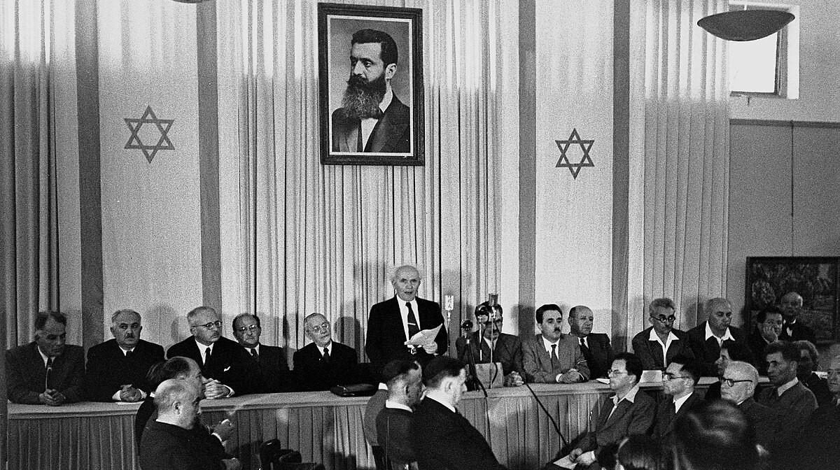 David Ben-Gurion formally proclaiming Israeli Independence in Tel Aviv on May 14, 1948, with a portrait of Theodor Herzl, the founding father of modern political Zionism, hanging above