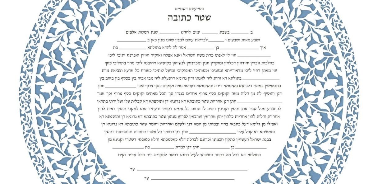 The phrase “modern ketubah” will mean different things to different people. For some, it might mean a unique ketubah design, including new papercut ketubah styles, both elegant and modern with a 3-D effect. While modern aesthetically, it could still come with the same text that’s been used for millennia.