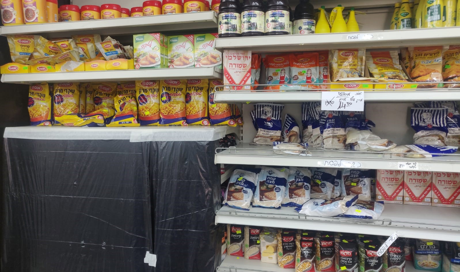 Inside a grocery store in Jerusalem, with chametz products taped off and unavailable, and technically under the ownership of a non-Jew for the duration of the holiday